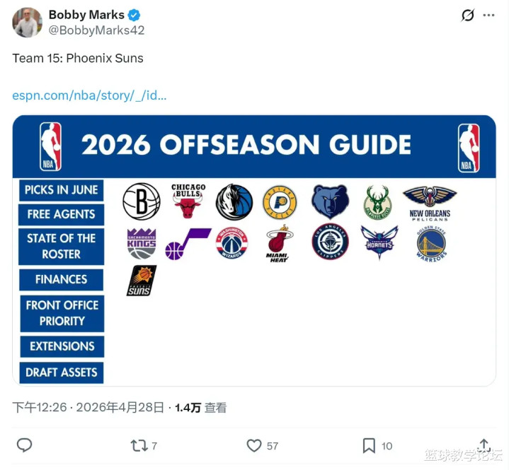 北京时间4月28日,NBA季后赛:魔术94-88战胜活塞,总比分3-1;雷霆131-122击败太阳,总比分4-0晋级下一轮;掘金125-113轻取森林狼,总比分追成2-3。太阳成为第一支出局球队,薪资专家Bobby Marks分析了太阳休赛期的续约问题。